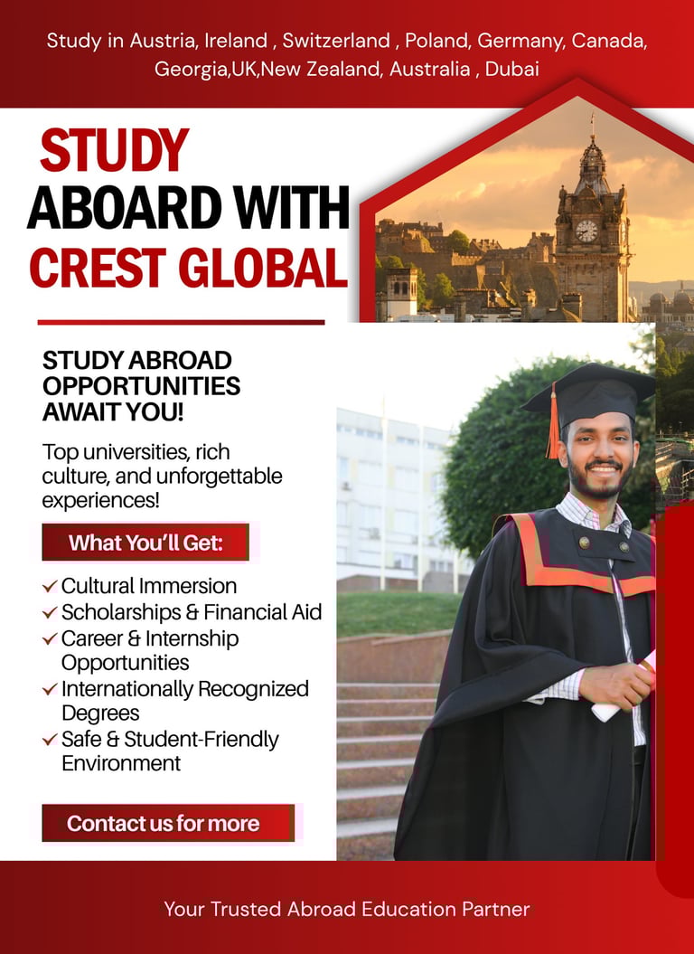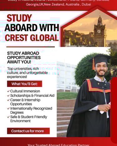 Crest Global Education, Established in 2021, is a trusted Kerala-Based overseas eductions consultancy dedicated to guiding Indian students toward quality education in International Institutions.We specialize in offering cost-effective service pakeges that ensure a smooth admission process, from selecting the right country to completing the chosen course with a focus on english speaking .